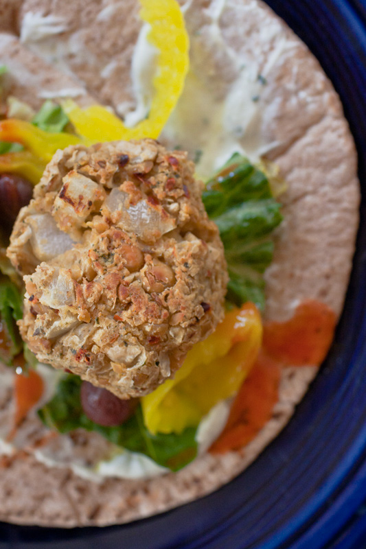 A healthy, vegetarian falafel sandwich made with baked falafel balls and lots of fresh veggies. Makes three sandwiches with two falafels each.