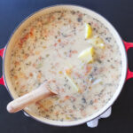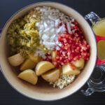 The potatoes are large, quartered Yukon Golds that hold their shape. Evaporated milk replaces heavy cream for a lighter, milkier broth that lets the green chile and cheese flavors come through cleanly. The cheese goes into the bowl, not the pot. Hot broth is ladled over shredded cheese at serving creates pools of melted cheese in every spoonful. Crushed dried chiltepin chiles finish each bowl instead of hot sauce. Chiltepins are small, intensely hot wild chiles native to the Sonoran Desert. They add heat without masking the subtle flavors of the broth.